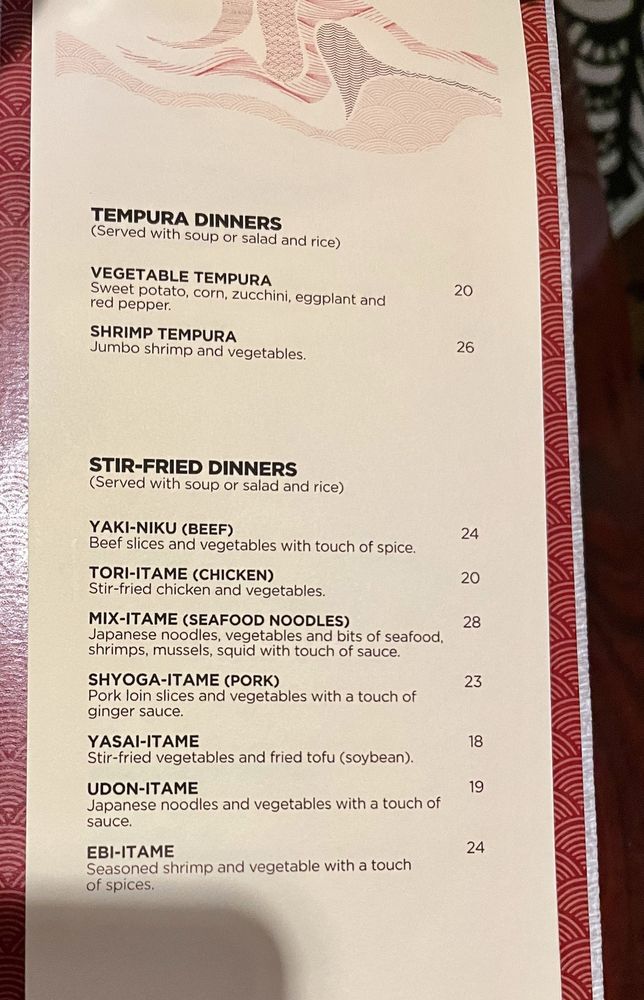Tender jumbo shrimp and fresh vegetable tempura, served with rice soup or salad.